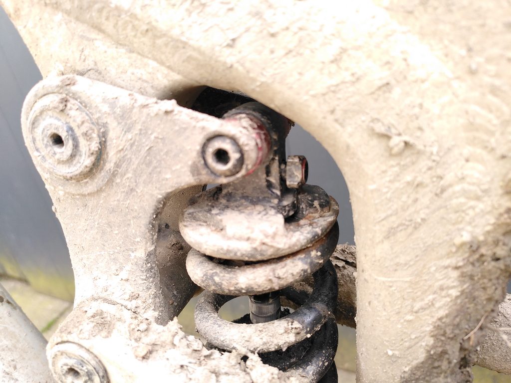 - Und ein zweites Tribut an die schlammigen Trails (nebenbei: regelmäßig full-serviced) und vermutlich der kopfüber Montage geschuldet… (Ihr müsst ggf. was zoomen) … isso. Ansonsten: Was für ein Rahmen/Bike für den Preis und Hersteller-Service/Support!!!